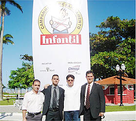 Em frente ao banner da campanha: o gerente de canais da Dinap RJ, Rodrigo Abreu; o especialista em marketing da Dinap RJ, Felipe Borba; o prefeito Francisco Ribeiro e Mário Perrut