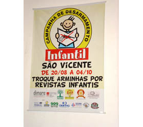 No último dia 20, mais uma cidade aderiu à Campanha de Desarmamento Infantil. Até 4 de outubro, as crianças de São Vicente (SP) poderão trocar arminhas de brinquedo por revistas infantis da Editora Abril, em 37 postos de troca no município. A cerimônia de abertura contou com a presença de mais de 2 mil crianças de cerca de 40 escolas, autoridades locais, como o prefeito Tércio Garcia e o secretário de Segurança Pública, sargento Rogério Barreto, os representantes da distribuidora da Dinap na região, Hugo Fernandes, e o representante da Dinap, Paulo Tadeu.