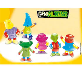 Genialiens formam a parte lúdica. São 12 bonecos montáveis que podem ter as peças trocadas em si, de acordo com a criatividade da criança. Para completar, tem as