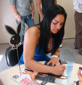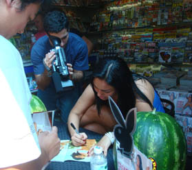 Já em São Paulo, no dia 11 de abril, a Garota Melancia visitou a Editora Abril, onde conheceu a redação da Playboy, a Dinap e autografou exemplares na banquinha interna do prédio. Depois, ela seguiu para uma sessão de autógrafos na Banca Quero Ler, no Ceagesp. Em uma hora e meia de evento, foram vendidos 220 exemplares- a segunda maior venda em sessões de autógrafos em São Paulo. "A Garota Melancia gera muita mídia espontânea, é um fenômeno. E a Dinap está aproveitando a oportunidade para vender ainda mais", explica Mônica Romano, especialista em marketing da Dinap. Além de aproximadamente 300 fãs, a imprensa também marcou presença no evento.