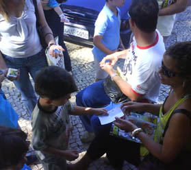 Aproveitando o fluxo de crianças e jovens, já que há quatro escolas na região, os jornaleiros imprimem cartazes para colar no PDV e divulgar o evento. Segundo Maria José, a distribuidora local também apóia, agilizando a suplementação de álbuns e figurinhas.
