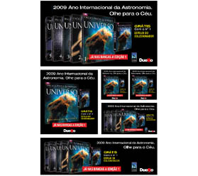 Folha de S. Paulo, comerciais de TV e rádio, glacês para distribuidores e pôsteres em associações de astronomia
