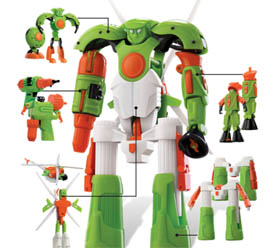 Recreio que traz 23 objetos que se transformam em robôs. Toda semana, a revista trará, além dos brinquedos, uma história em quadrinhos e fascículos da