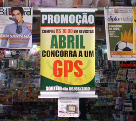 O jornaleiro Lauro Nishi, dono da Banca Brigadeiro, de São Paulo (SP), lançou uma promoção na última sexta-feira (2/7). Ele sorteará um GPS entre os clientes que comprarem 10 reais em revistas da Abril. Para divulgar a ação, foram confeccionados dois banners, um para ficar na entrada e outro na lateral da banca.